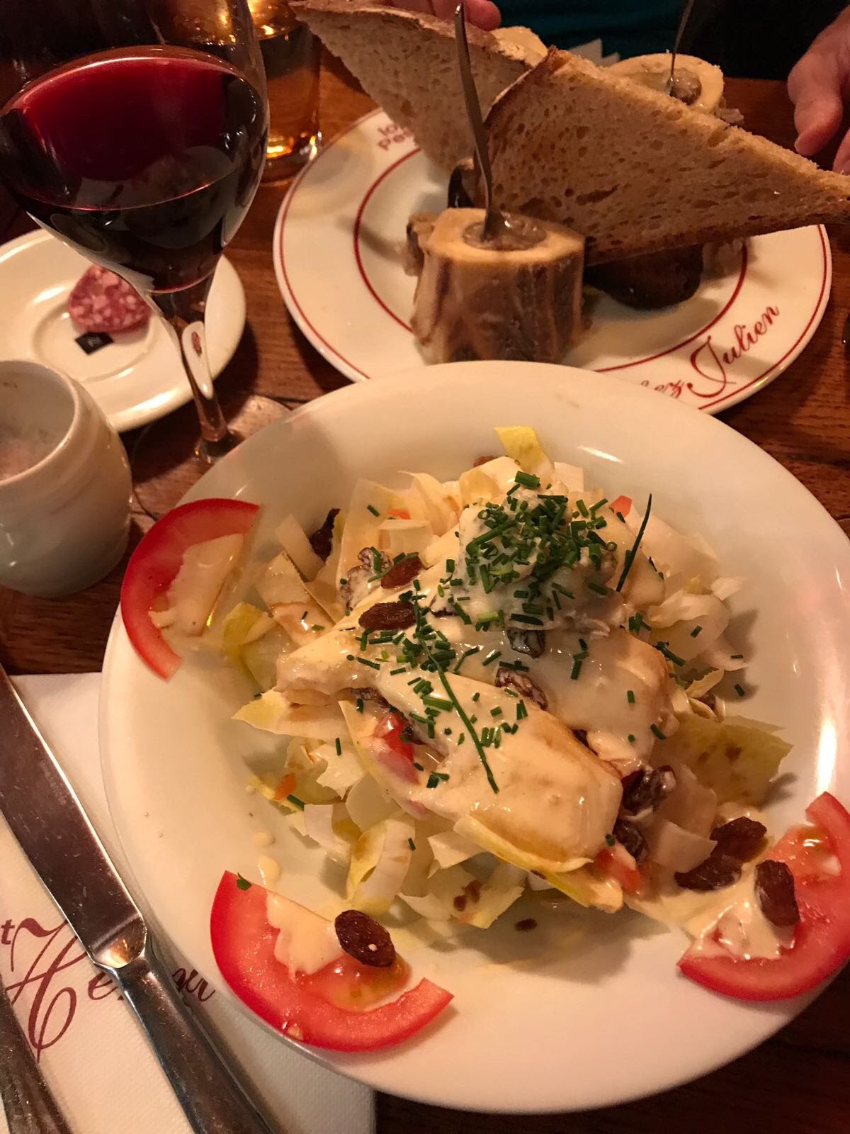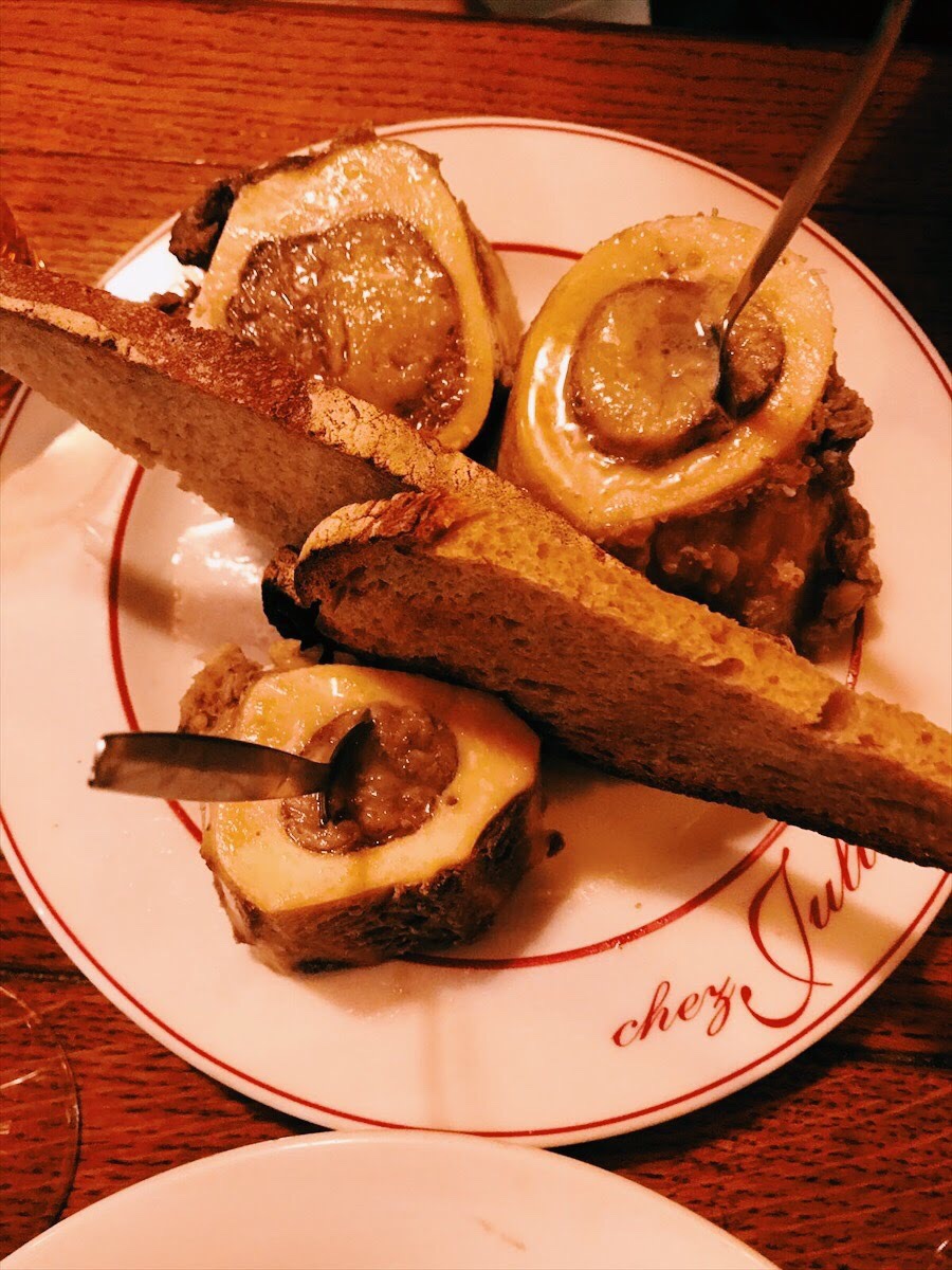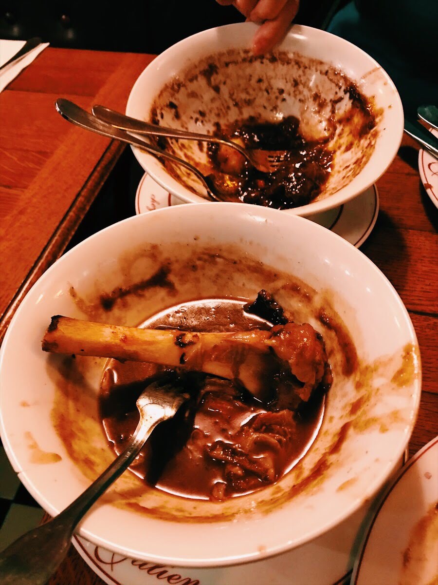 On one of our nights on the Left Bank, we stumbled across a teeny tiny restaurant that had good ratings online and was right near our hotel, Le Bistrot d’Henri. We had no idea what to expect but the hostess was very kind and told us to please sit down, helping us with our broken French and explaining lots of things to us. We ordered the house salad, an appetizer of the bone marrow toasts, and the Bœuf Bourguignon for our entree. Everything was incredible. The portions were gigantic, much too big for two people to share. The salad had chicory in it as well as this mustard vinaigrette dressing that was was sweet and spicy and sour all at once. When the bone marrow arrived we couldn’t keep ourselves from laughing at the size of it! We didn’t know what to expect, only that we had read about it being on many French menus, but we hadn’t eaten it before. So what’s it like? I can’t really describe it only to say that as I was eating it, I could only think of this: meat butter. It’s rich and salty and decadent. Maybe one of the best things I’ve eaten in my entire life. The Boeuf Bourguignon was so good that we don’t have any photos. We only have photos of the empty bowls, which is proof in itself I guess. It was rich and smooth and the meat melted in your mouth like jelly. My mother was practicially drinking the liquid from the bowl. The place was small, at one point we were literally sitting in between the door and the coat rack, with the coats actually hanging on top of us. But we loved it, and it may have been the best dinner of the whole trip.