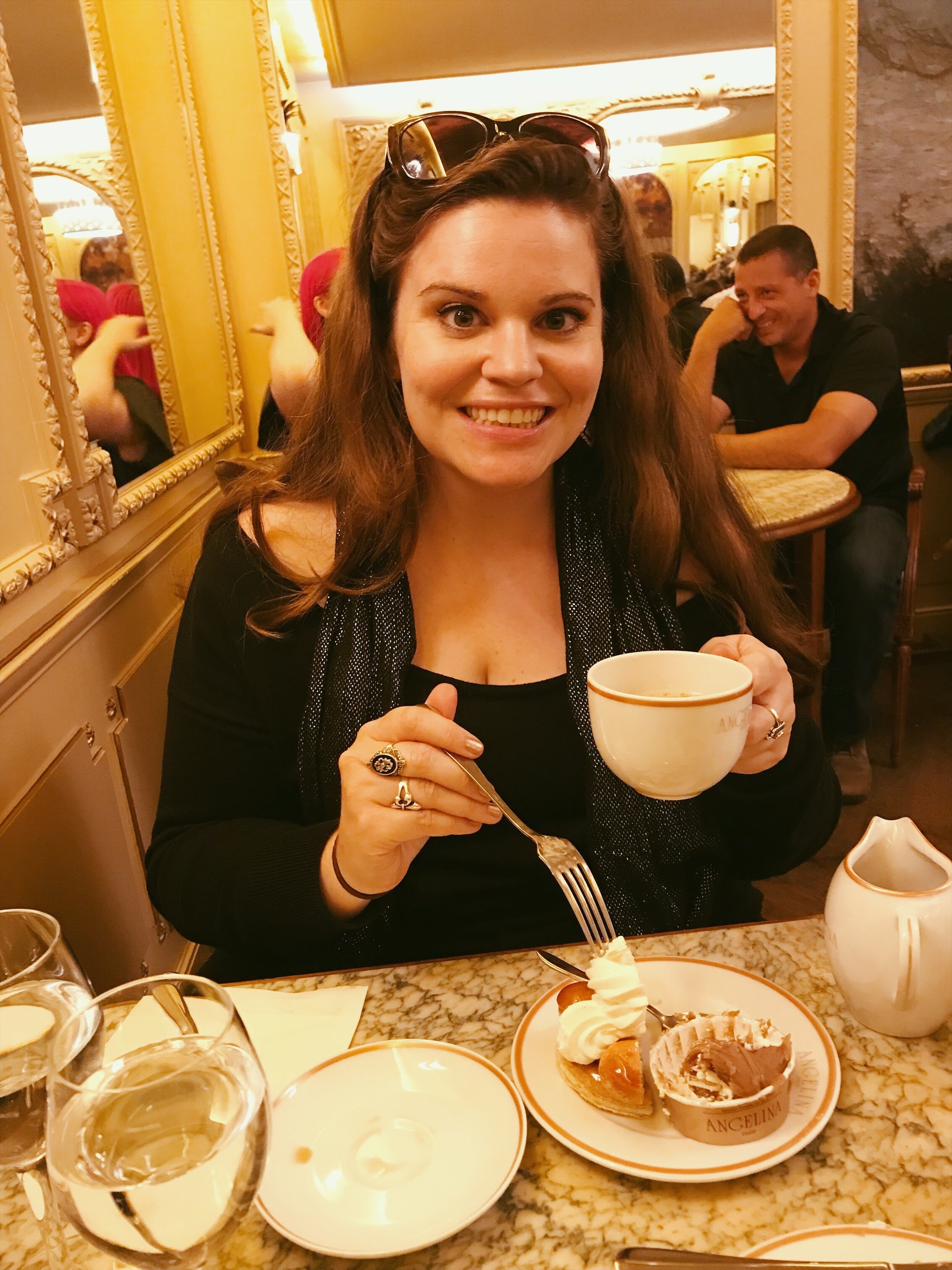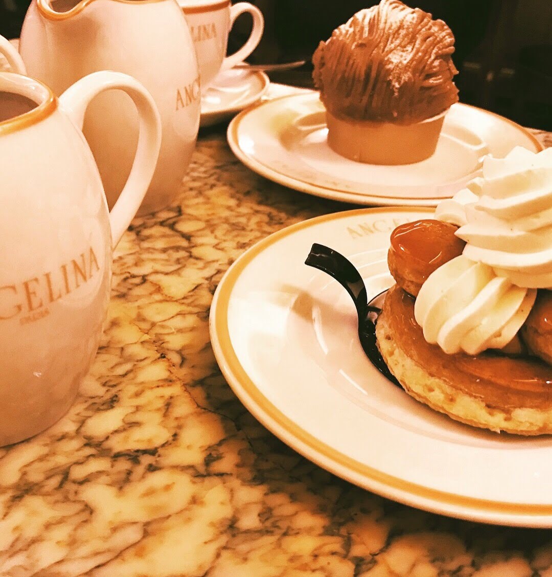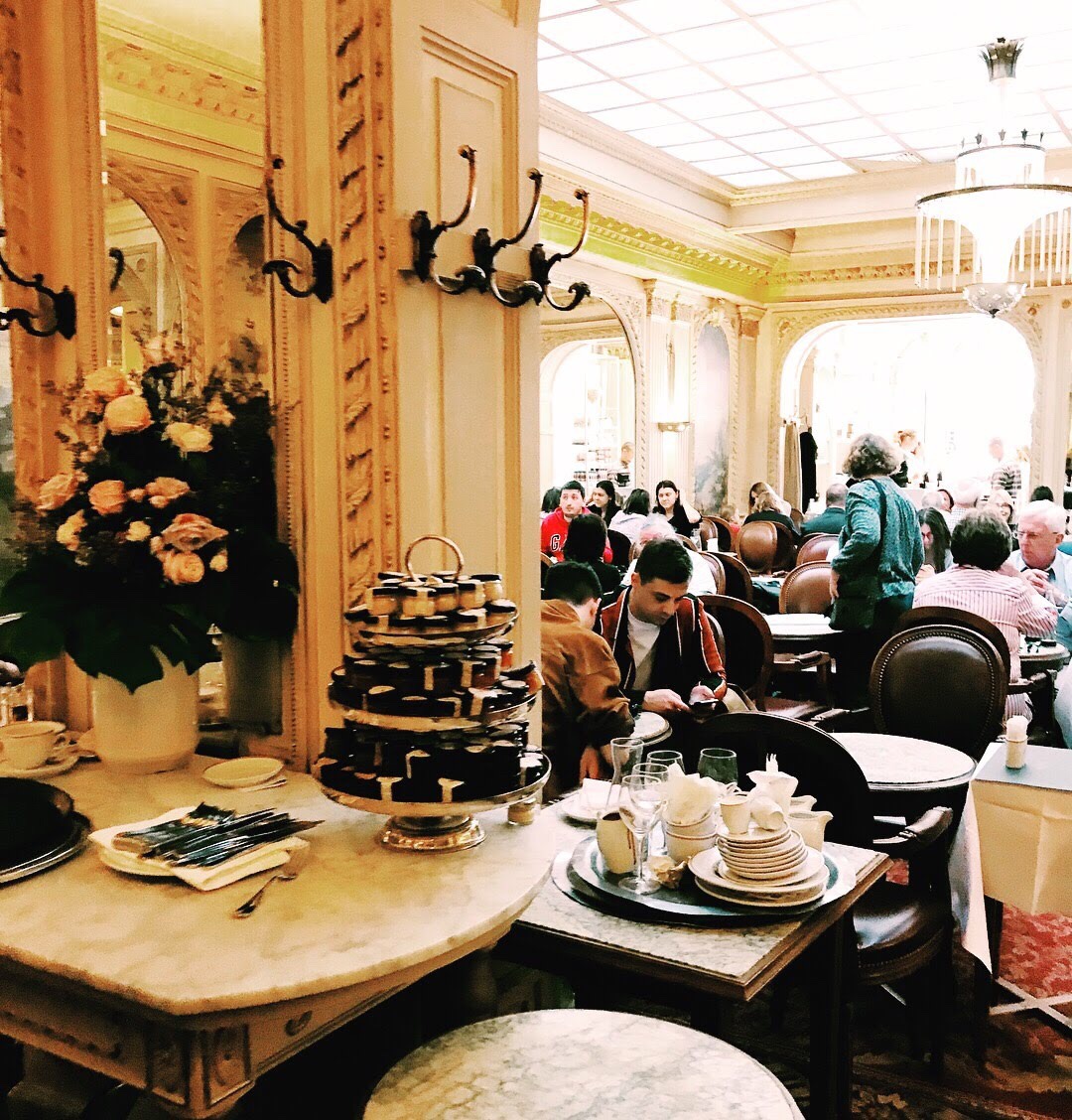 The next few days were spent near the Tuileries, touring the museums with an extra goal of mine to finally buy my favorite scent from the Serge Lutens store in the Palais Royal which required getting turned around near lots of vintage stores. Those days are filled with memories of again, the quiet moments when we stopped to soak in the ambiance. Wanting to get away from the Louvre crowds, we stopped and sat for long period of time in the Tuileries. Then we had many afternoon coffees at Angelina’s. I had read about Angelina’s Tea Room and the famed hot chocolate in one of the many guidebooks and at first I wasn’t sure. I thought it might be gimmicky or have over priced service with sub par desserts. I have to say, it exceeded my expectations and quickly became our favorite cafe to get away from the crowds when near the Tuileries. We never had to wait in line and always got right in, and the waiters never made any kind of face when all we would order were a cafe au lait and a pastry to share. The atmosphere was warm, friendly, and beautiful. The pastry shop is right out of an old hollywood set featuring ‘Paris’ as the backdrop.