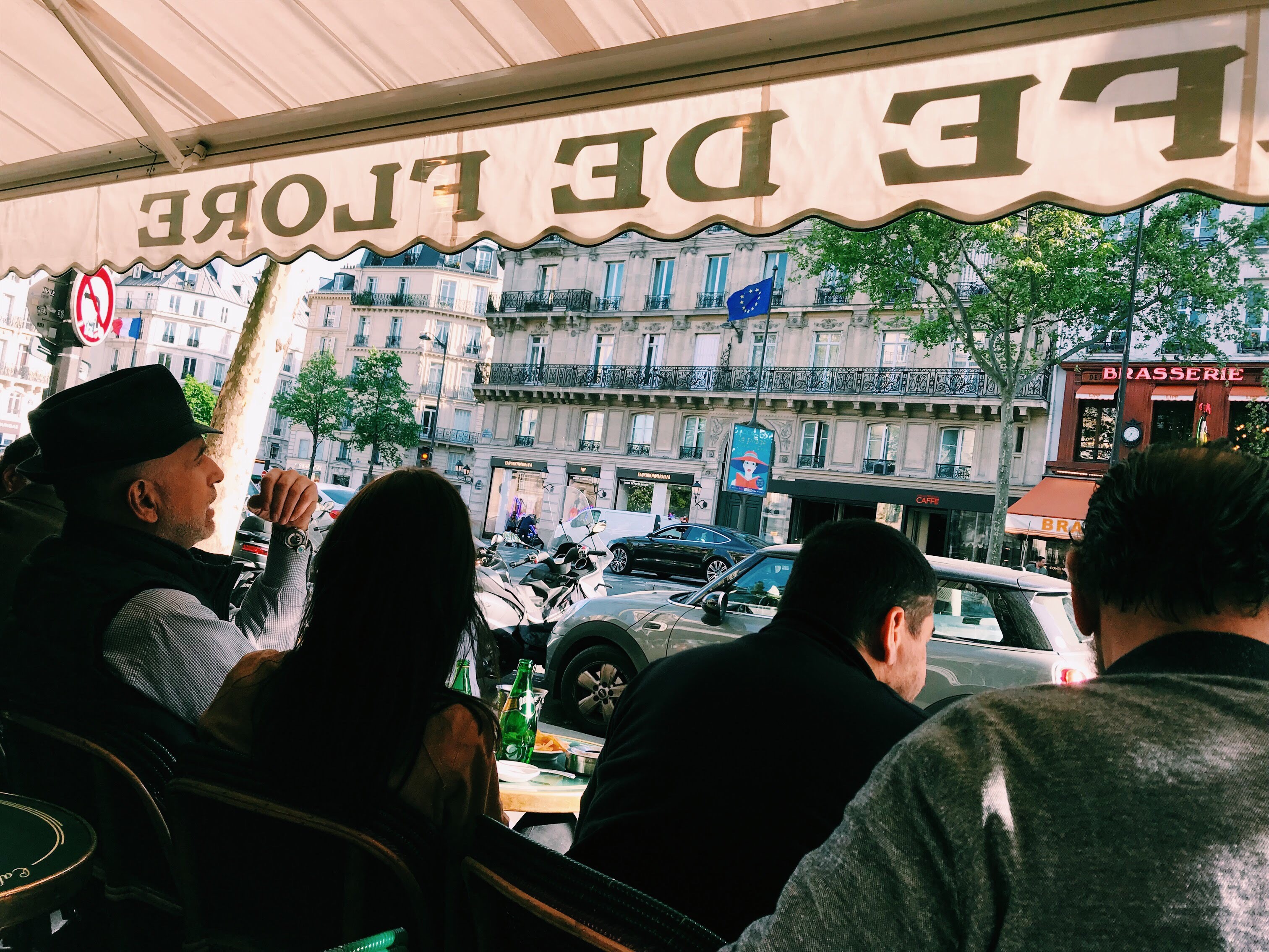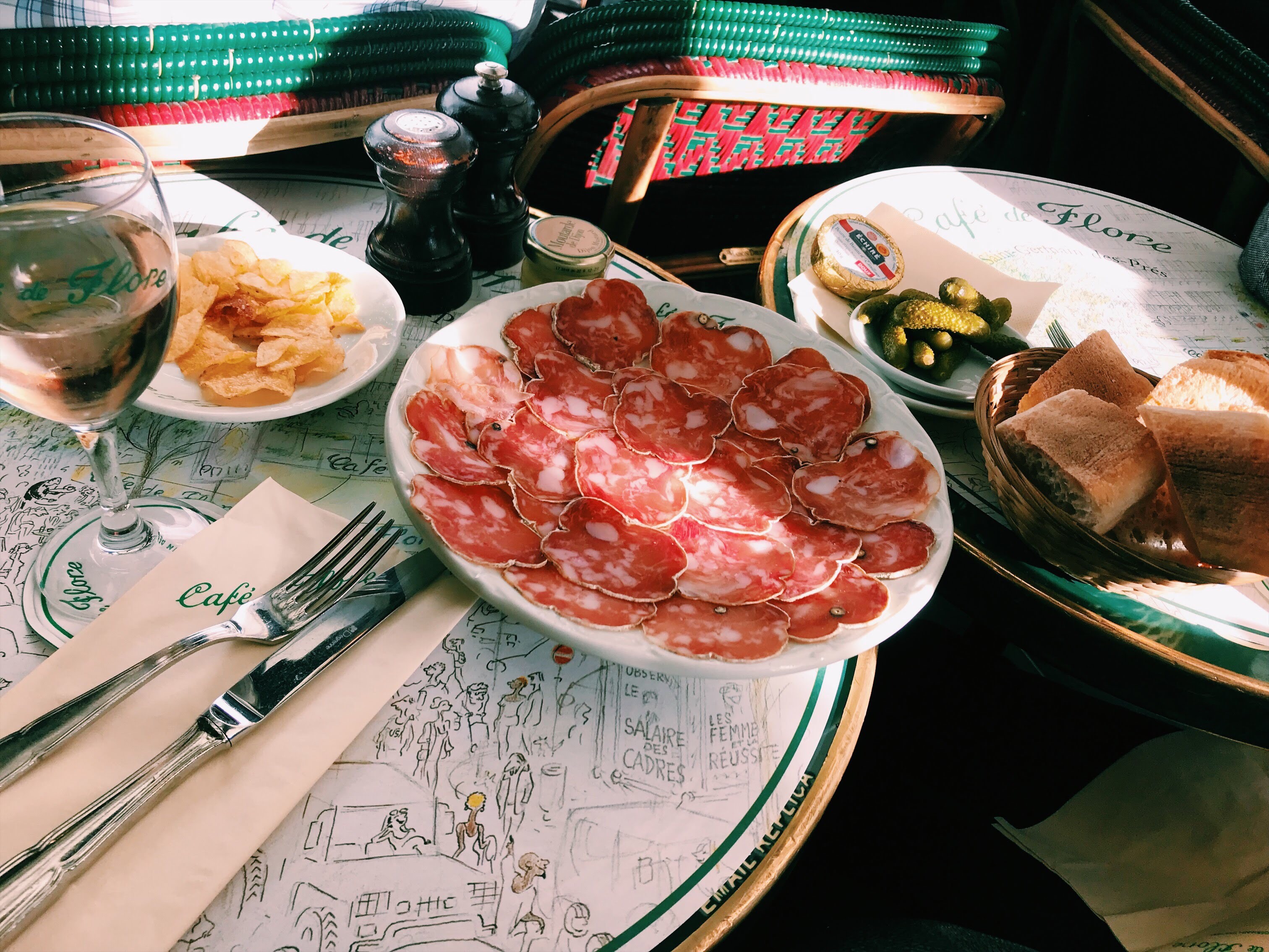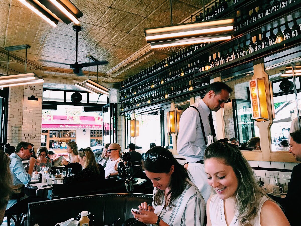 Nearly every afternoon, after wandering all over, we would wind back around to Cafe de Flore in St. Germain and sit and people watch. Again, Cafe de Flore is one of the most famous cafes in Paris because it is supposedly the very cafe that Picasso and Hemingway loved. You will see tourists stop and take posed photos as if they were in fact eating there (although they weren’t) but you will also see locals who the waiters know by name who will be served their favorite glass of red without needing to order it. Again, i was worried we might be rushed out the door and that the menu might be outrageously overpriced. Again, I was very surprised when we were instead greeted with such warmth and friendliness and it was a welcome extra treat to find that a double cafe au lait (big enough for two coffees and with your own pot of milk) was only 5 euro. Sitting at those so very french tables where your chairs sit side by side so that you are forced to people watch, drinking cafe au lait and listening to the ‘hellos’ called out from waiters to neighborhood locals, was one of the best moments of the whole trip.