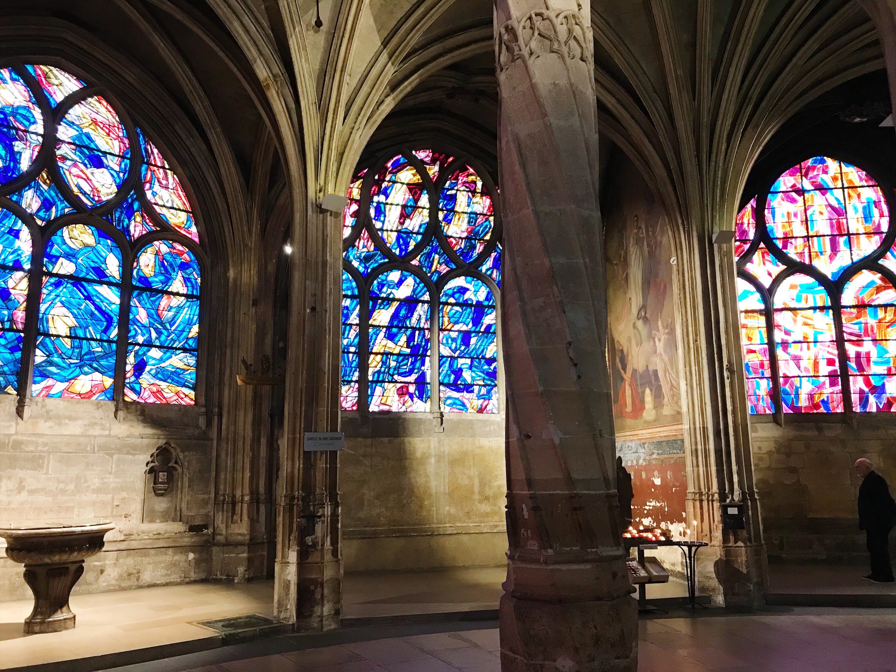 During those first days, we also made it back to Odette’s to try a trio of their Instagram famous cream puffs. They were good, but the setting was better. Odette’s is however not far from St. Severin Cathedral, a cathedral that doesn’t get much attention in a city with much bigger rivals, but one that inspired me and is one I still think of as having the best interior I’ve experienced. The stained glass there is modern and looks like an impressionist painting. When the light shines through, the walls are either on fire in a magenta sunset or filled with violet and blue soft light.