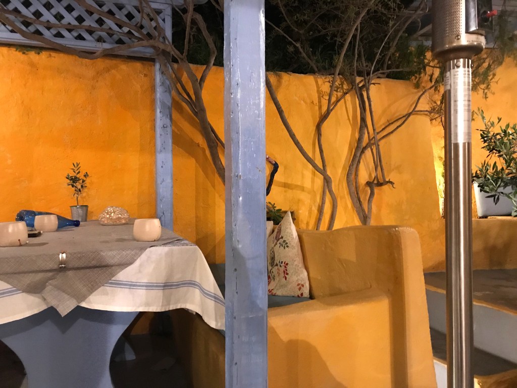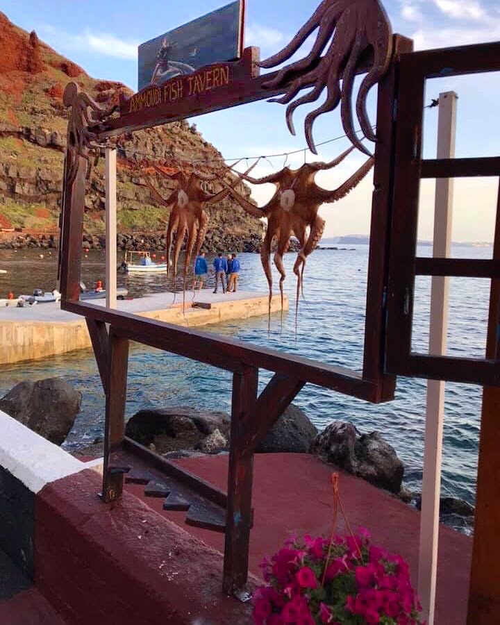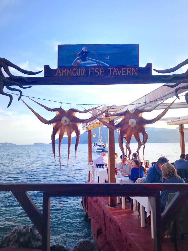 Underneath Oia, at the foot of a winding cobblestone path lies Ammoudi Bay. It’s a popular place for tourist and fishing boats to dock and is home to several seafood restaurants. On our second night in Oia we headed for dinner at Ammoudi Fish Tavern. Right away, our eyes were drawn to the sign of the restaurant which was strung with octopuses (octopi ?) drying out in the sun. Ammoudi Fish Tavern is not just an old fish tavern, but quite an upscale fine dining restaurant offering meze and fish and ouzo (oooh so similar to my Turkish ‘raki balik meyhanes’ I love so much…link here for prior post https://girlmeetsturkey.blog/2020/02/23/one-of-my-favorites-eleos-meyhane/).Â